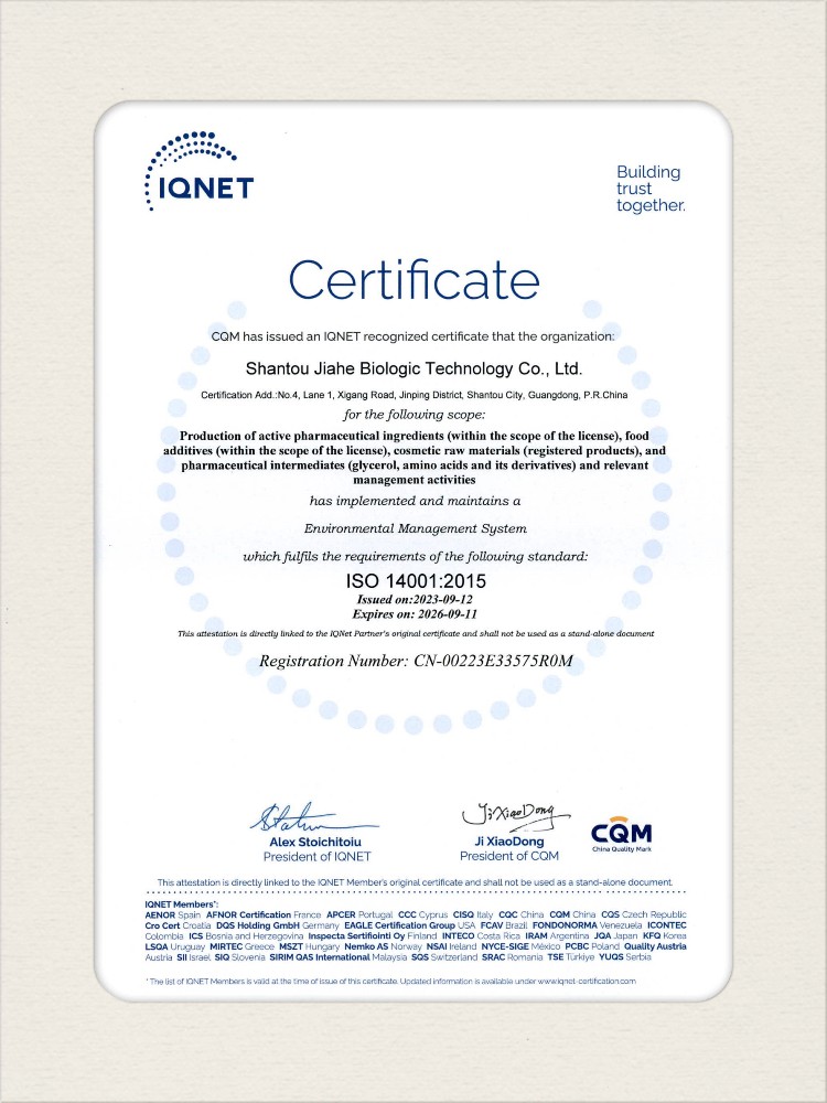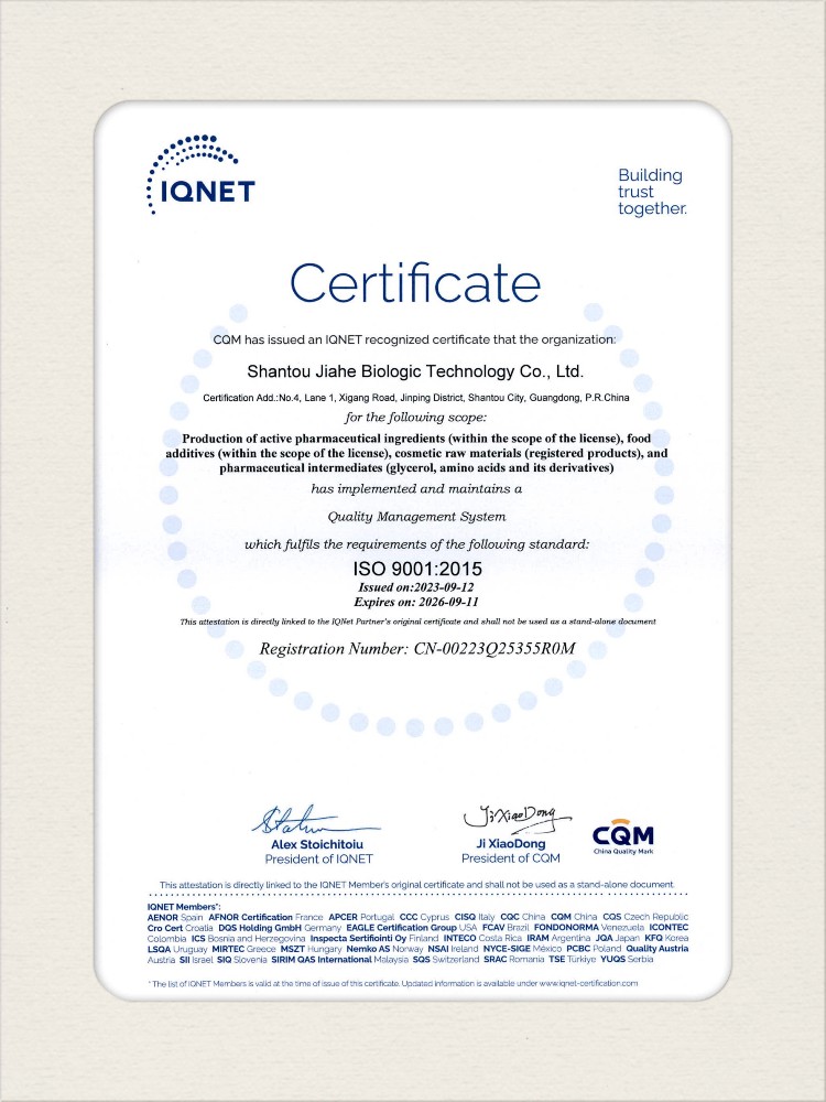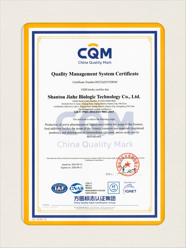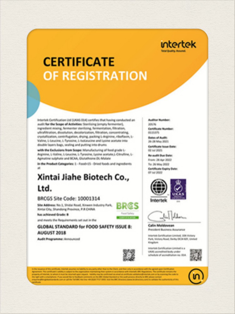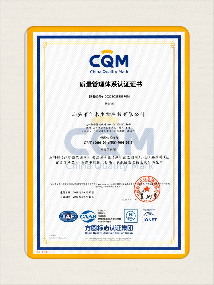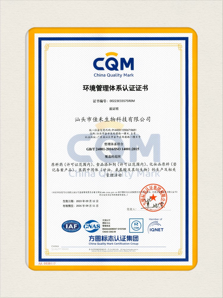 汕头佳禾生物科技有限公司是一家致力于氨基酸及其衍生物研发、生产和销售的国家高新技术企业,先后通过了国家药品GMP认证,ISO9001质量体系认证、ISO14001环境管理体系认证。目前,公司拥有“广东省专精特新中小企业”、“广东省氨基酸产品工程技术研究中心”、“汕头市生物发酵工程技术研究开发中心”、“汕头市知识产权优势企业”、“多项国家发明专利”、“广东省守合同重信用企业”等多项资质和荣誉,旗下“佳禾牌”系列产品已成为原料药行业知名品牌。 新泰市佳禾生物科技有限公司成立于2012年8月,注册资金2亿元,公司位于山东泰安新泰市新汶工业园区,是国 家级高新技术企业、山东省“专精特新”企业、山东省制造业单项冠军企业、泰安市科技型中小企业、泰安市农业产业化龙头企业、中国生物发酵产业协会理事单位。